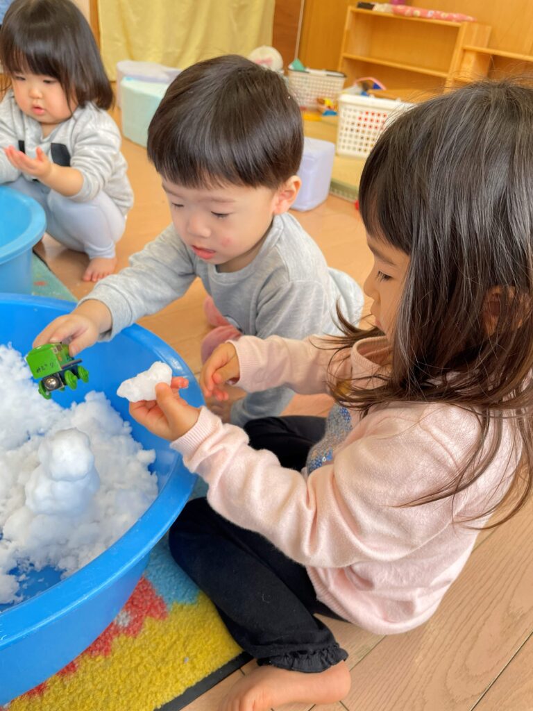小さなお友達は、お部屋のなかに、雪を持ち込んで雪あそびしましょう!