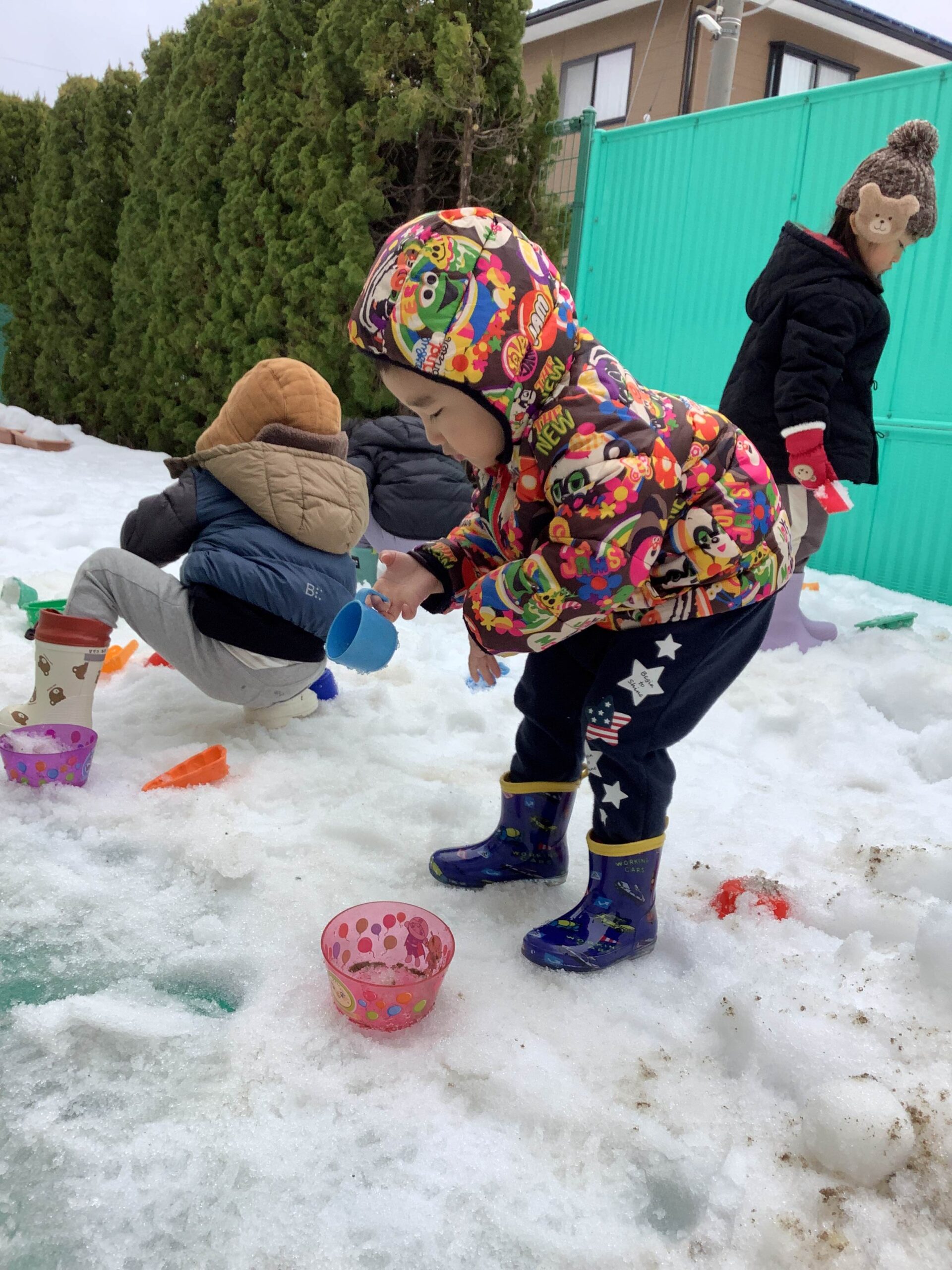 雪が積もったら、園庭やテラスで雪が遊びをしましょう!外は寒いので温かい服装でいらしてくださいね!